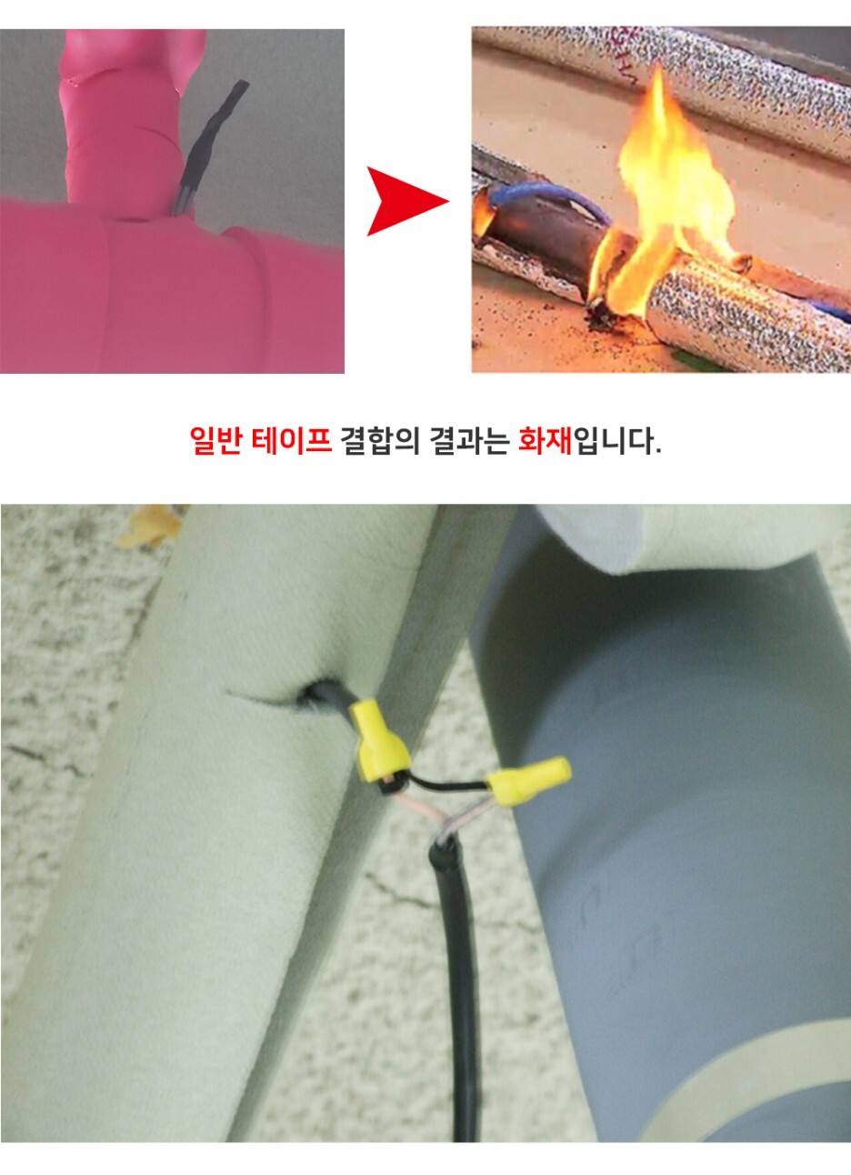 - 열선과 열선의 크로스 부분과 티분기 부분을 히팅케이블끼리 결합하는 것은 화재를 발생시키는 원인이 되며 절대 하지말아야할 시공입니다.